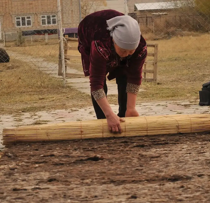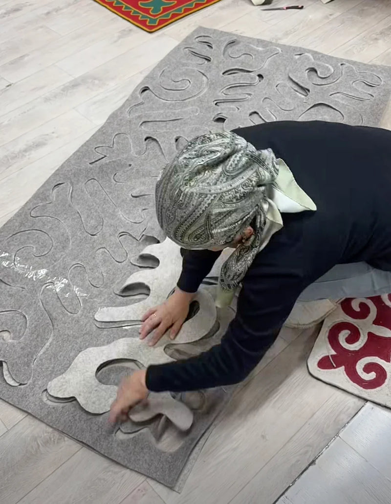 Once the felt is ready, artisans carefully trace and cut intricate geometric patterns. Each design carries symbolic meaning, reflecting nature, family, and Kyrgyz nomadic traditions.